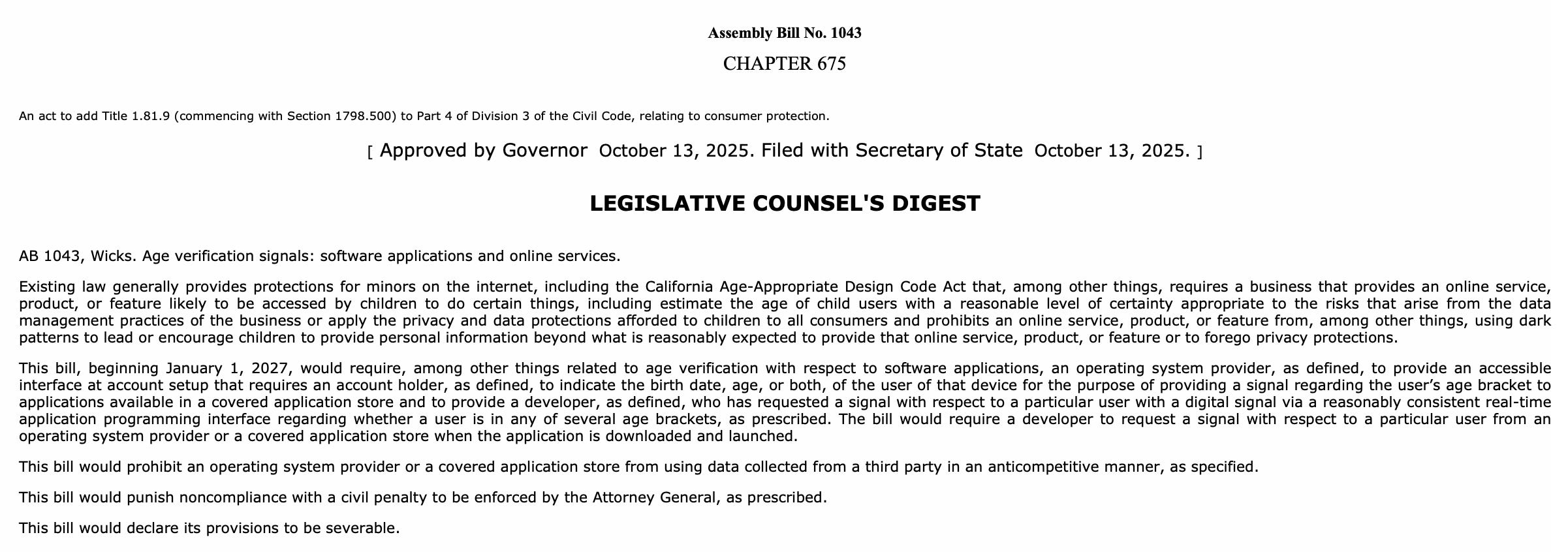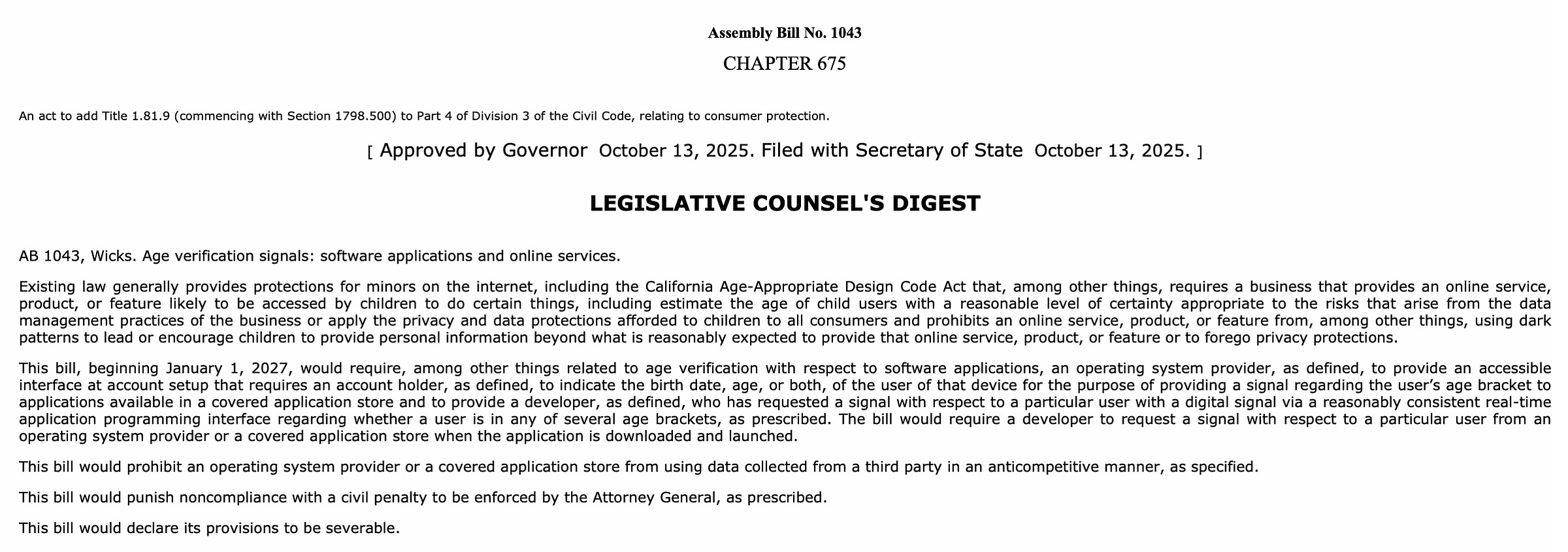On October 13th, 2025, our very own California Governor Gavin Newsom signed a law dubbed the Digital Age Assurance Act, AB 1043.