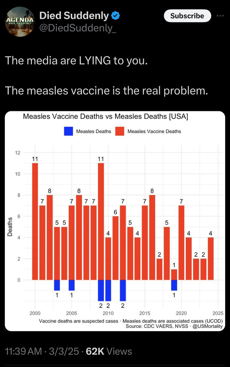 I had the pleasure of speaking with Dr. Henry Ealy today, a naturopath and founder of the Energetic Health Institute, who has been following this disturbing pattern for years as well, as covered in my recent Substack, The Measles Mirage: A Case Study in Government Overreach and Lies. As he pointed out, these measles "outbreaks" conveniently emerge whenever legislators are eyeing the removal of conscientious or religious vaccine exemptions, or the nomination of key political figures.