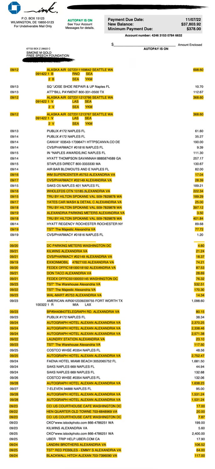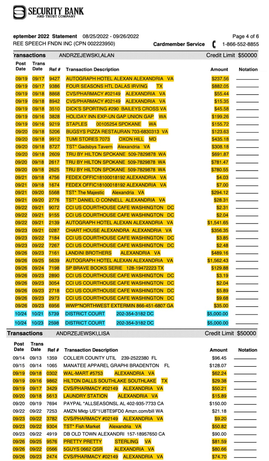 What I have also received, beyond those above, is a very extensive list of bank statements and transactions of Gold’s activities that include bankrolling her and John Strands’ stay and expenses around his January 6th court hearing last September…. utilizing AFLDS funds, including $10,000 in court fees (in blue, below).