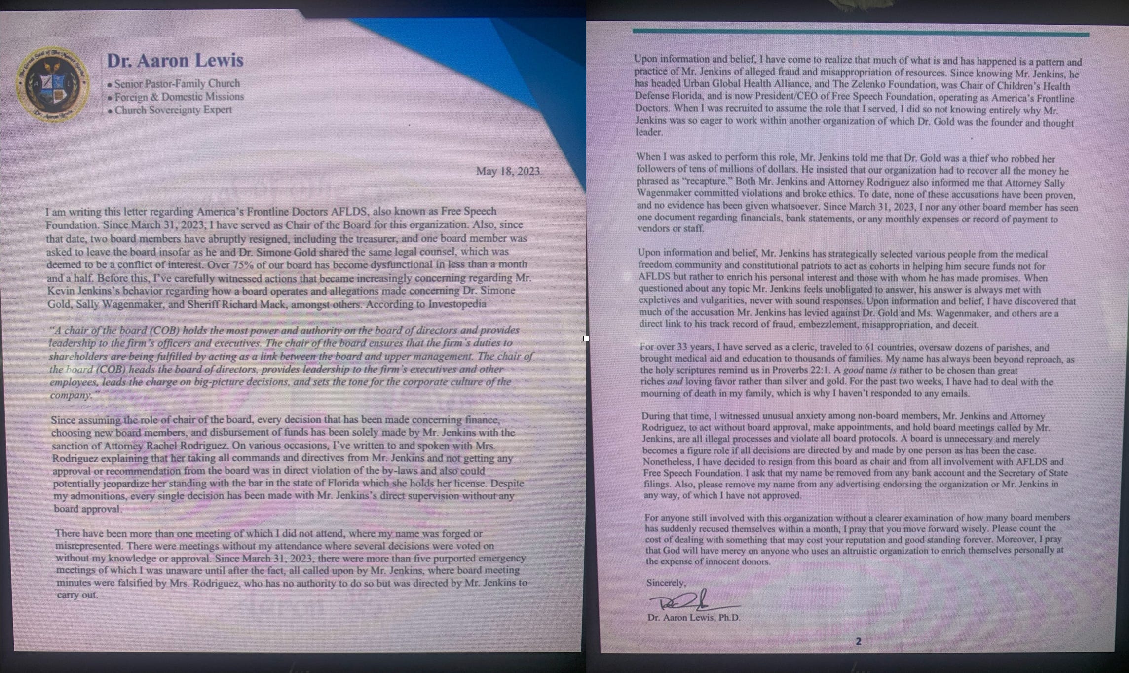 On May 18, 2023, 10:45 pm, one Aaron Lewis forwarded an email under the subject “An open letter from Aaron Lewis to AFLDS et al.” to the following Free Speech Foundation dba America’s Frontline Doctors leadership and Board members. The email was also forwarded to former Board Members: Cordie Williams and Stephen Guffanti. (Exhibit A, May 18, 2023, Email Transmittal Cover).