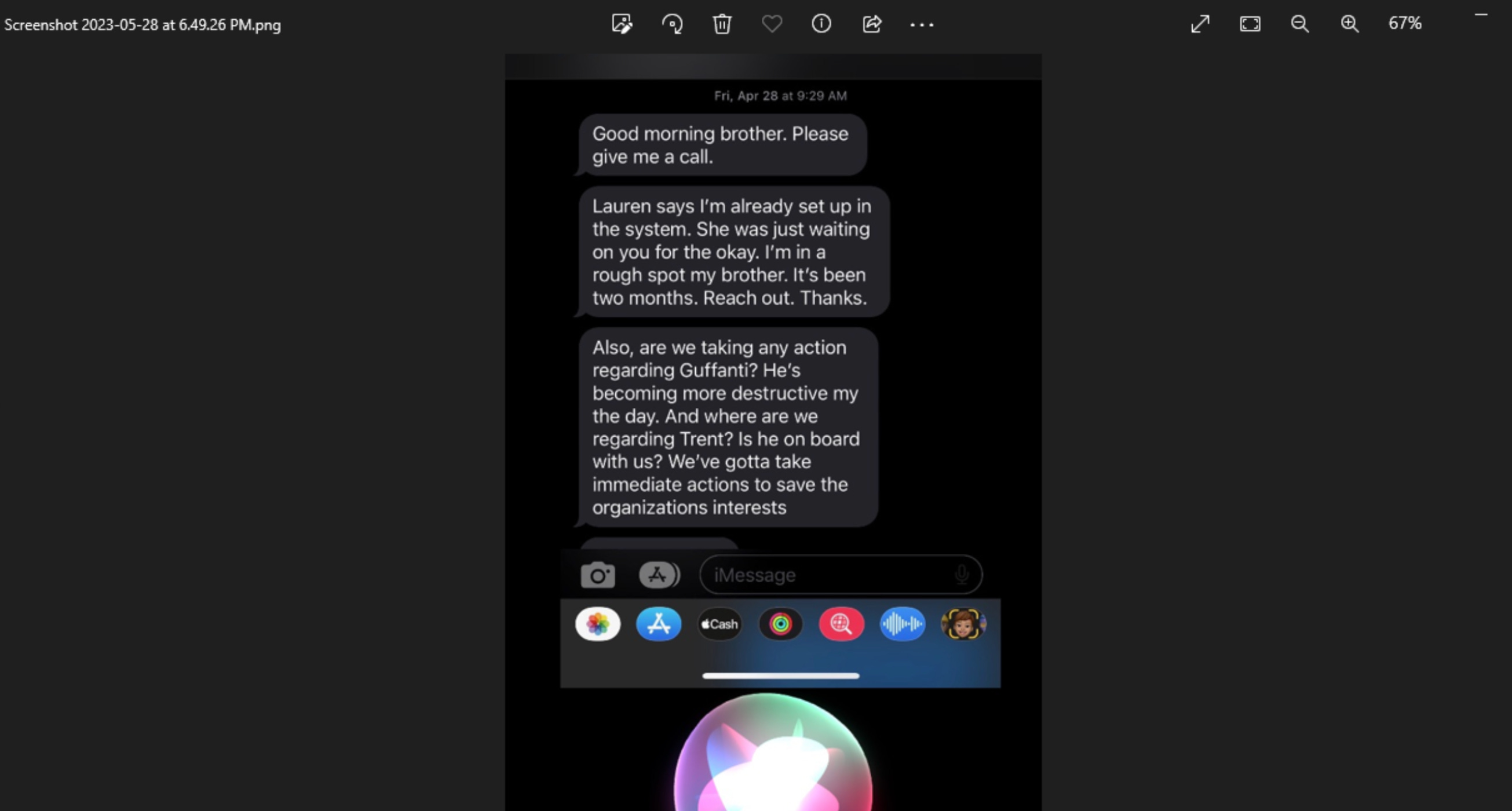 During Mr. Jenkins’ thirteen (13) day absence (April 19, 2023 – May 2, 2023) from the organization, Lewis, along with the organization’s Chief Financial Officer (CFO), JoAnna Laiscell, immediately began to contact Lauren Bradford, COO and Rachel Rodriguez, General Counsel with attempts to convince the two leaders to approve and fund the request of Chairman Lewis’ $15,000. monthly compensation. Please note JoAnna Laiscell’s hiring as CFO, came at the advice and promotion of Lewis. Lewis and Ms. Laiscell were advised on several occasions by Bradford and Rodriguez that the matter must be brought to the board and that there was obvious impropriety of changing the organization’s by-laws for the sole purpose of rendering compensation to Lewis. Nevertheless, the pressure continued from the chairman and the CFO, until April 28, 2023, when Ms. Bradford advised, she would not make such a decision, without Mr. Jenkins approval, upon review by the Board. Lewis then sent a text to Mr. Jenkins stating, “Good morning brother. Please give me a call. Lauren says I’m already set up in the system. She was just waiting on you for the okay. I’m in a rough spot, my brother. It’s been two months. Reach out. Thanks.” (Exhibit E, April 28, 2023, text message from Lewis to Kevin Jenkins).