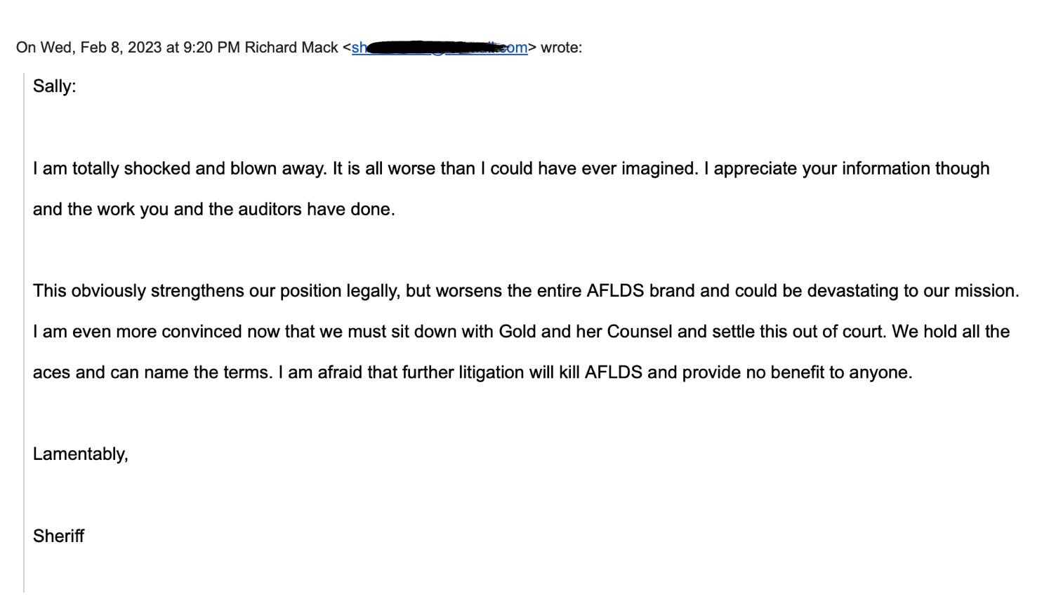 Despite what Mack claims today, it was clear that once Mack became acquainted with the inner workings of ALFDS, he had plenty of proof of Gold’s criminality as seen in this internal email to AFLDS’ attorney Sally Wagemaker.: