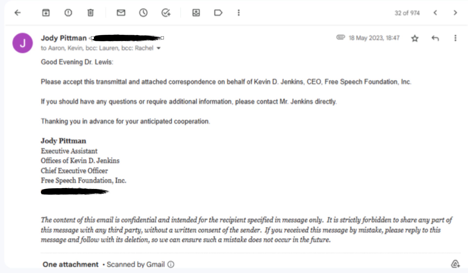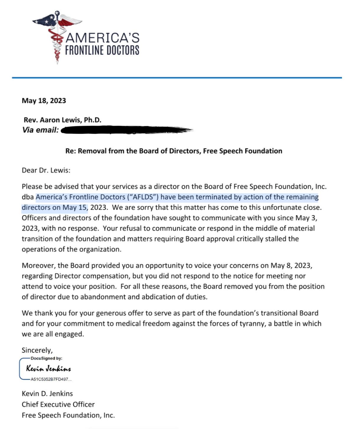 For purposes of history, please note that until four hours prior to receipt of the email from Lewis and as of March 31, 2023 (33 days), Aaron Lewis was the Board Chair of the Free Speech Foundation. On May 18, 2023, at 6:47 pm, Executive Assistant to the organization forwarded an email transmittal on behalf of Kevin D. Jenkins, directly to Aaron Lewis, attaching correspondence executed by Mr. Jenkins, advising Lewis of the Board’s decision officially to remove him in the May 15, 2023 board meeting, stating “Please be advised that your services as a director on the Board of Free Speech Foundation, Inc. dba America’s Frontline Doctors (“AFLDS”) have been terminated by action of the remaining directors on May 15, 2023.” (Exhibit C, May 18, 2023, Email cover and attached letter of Kevin D. Jenkins).