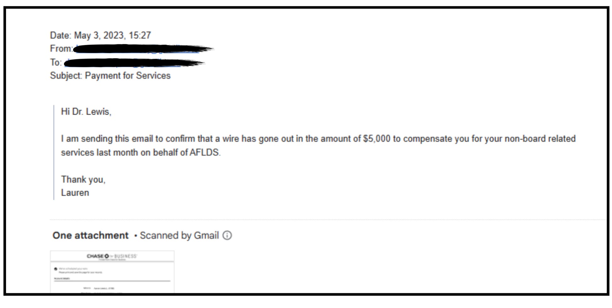 Lewis’ decision to make a record of falsehoods was solely with the intent to permanently defame the character of leadership and destroy the organization. This decision, without question, was based on leadership’s effective protection of the organization and donors from Lewis’ own efforts to engage in the very criminal actions of which he accused the leadership of AFLDS: embezzlement. On or about April 7, 2023, and after returning from a business trip (Tennessee Security Bank and Trust Co., 4/5 – 4/6/2023) with Kevin D. Jenkins and Rachel Rodriguez, Lewis advised Mr. Jenkins he’d lost “pay” while on the trip and wanted compensation for lost salary, requested $15,000. per month to serve as Board Chair. Mr. Jenkins agreed that Lewis should be reimbursed for any salary lost for engaging in activities beyond the general oversight and policy service of a Director of the Board, and he was paid $5000. on May 3, 2023, for costs due to his serving in the extra-directorial capacity. (Exhibit D, May 3, 2023, email transmittal from Lauren Bradford with Wire Transfer).