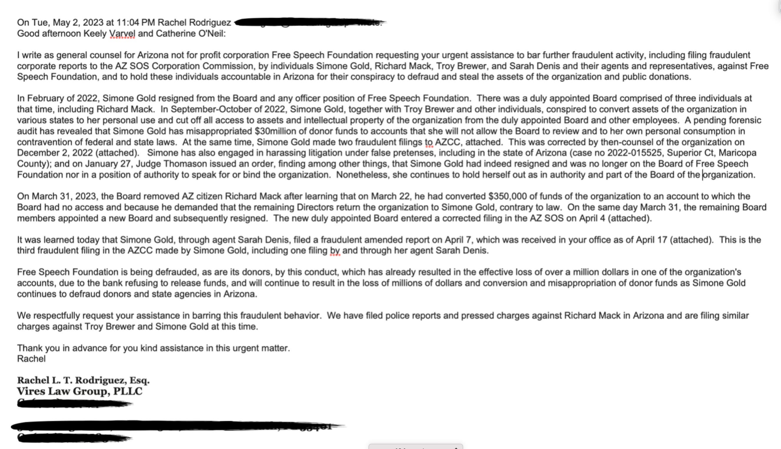 “Since March 31, 2023, I have served as Chair of the Board for this organization. Also, since that date, two board members have abruptly resigned, including the treasurer, and one board member was asked to leave the board insofar as he and Simone Gold shared the same legal counsel, which was deemed to be a conflict of interest. Over 75% of our board has become dysfunctional in less than a month and a half. Before this, I’ve carefully witnessed actions that became increasingly concerning regarding Mr. Kevin Jenkins’s behavior regarding how a board operates and allegations made concerning Simone Gold, Sally Wagenmaker, and Sheriff Richard Mack, amongst others;”