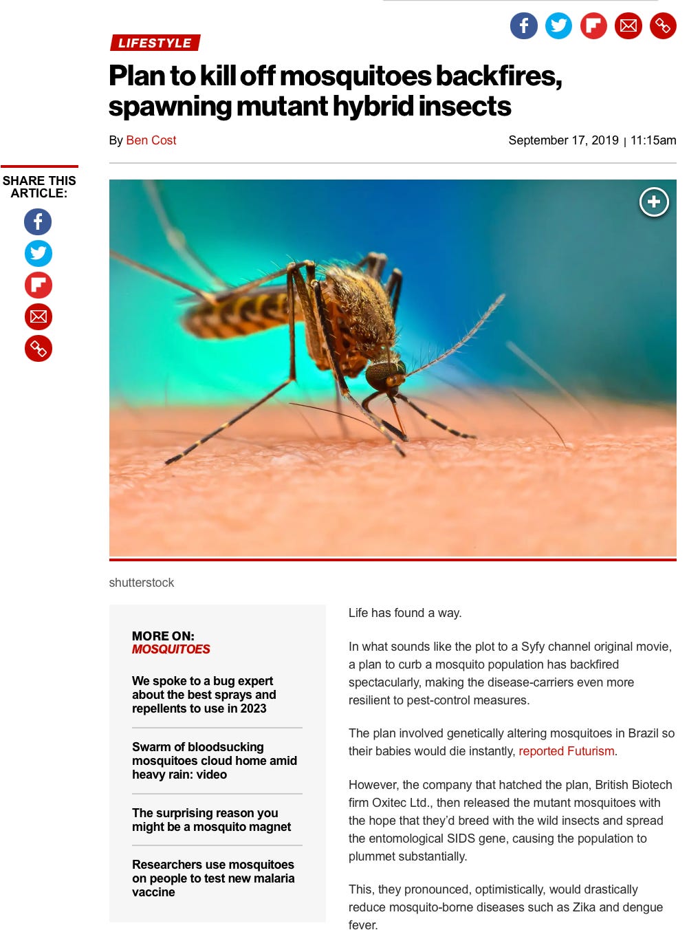The unintended consequences of these GM mosquito releases far outweigh the benefits. For instance, reducing ONE mosquito population means that another mosquito (like the Tiger mosquito) could fill the vacuum and continue spreading disease.