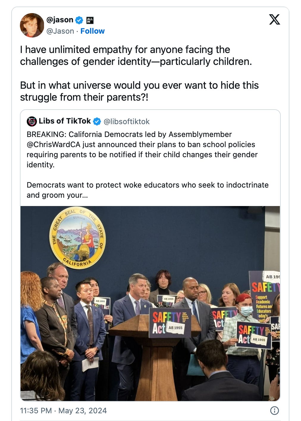 Let’s be clear. There are no “forced outing” policies in California. This is a false narrative manufactured to prey on people’s emotions.