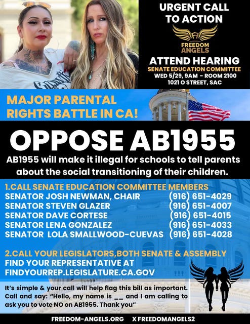 Please Note that this article comes with an Urgent Call to Action for Californians. Please attend the hearing of the CA Senate Education Committee on Wednesday, 5/29, at 9 a.m., 1021 O Street, Sacramento, Room 2100. AB1955 will make it illegal for schools to tell parents about their children's social transiting, setting a precedent for other states!
