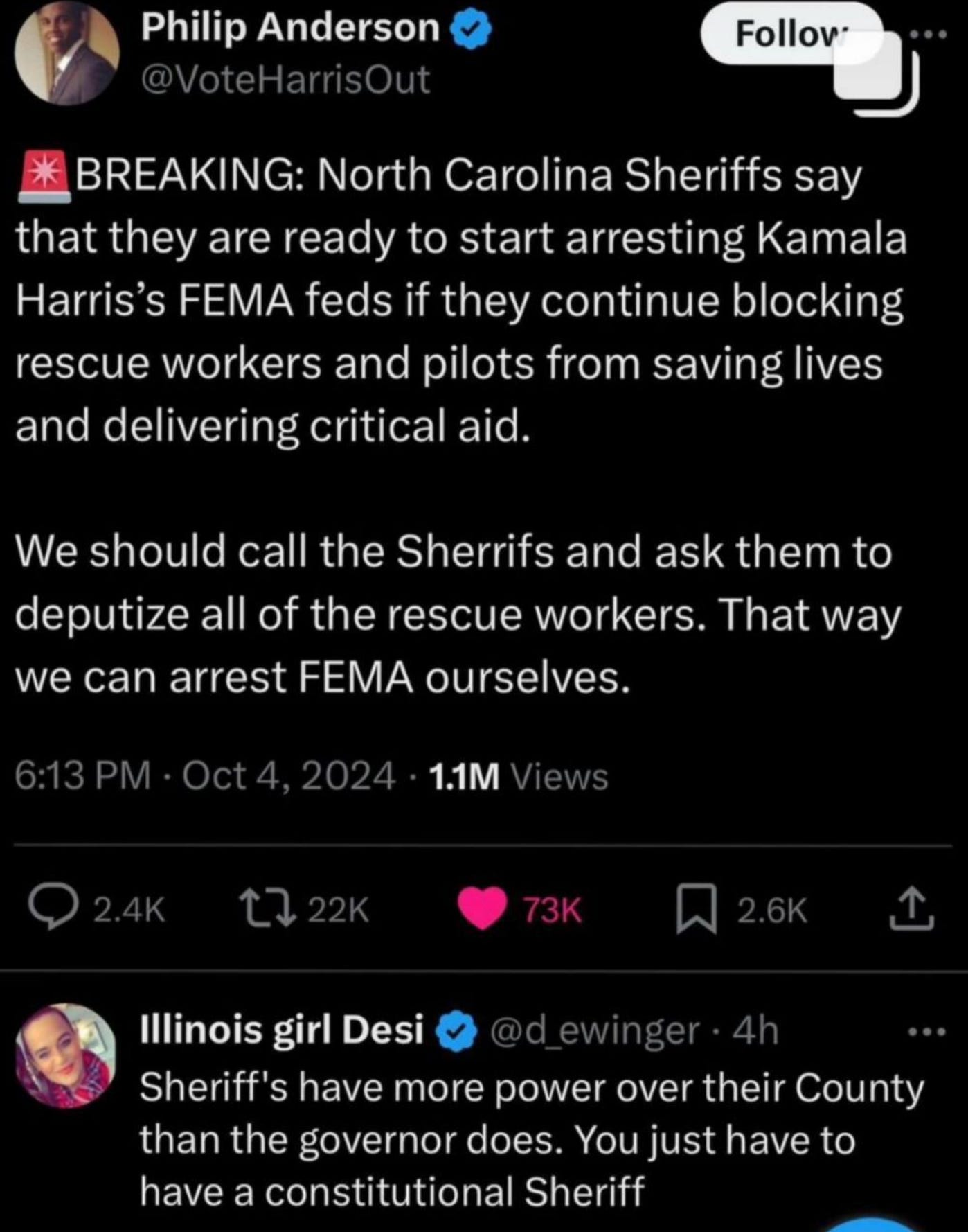 If you attempting to help in the recovery and you encounter FEMA, the National Guard, or any other authority that prevents you from rescuing or providing assistance while our government sits idly by, I highly recommend attempting to contact the sheriff in your respective area, listed below. Check if they're reachable and open to deputizing you and your party. This could help prevent the above agencies from stopping your efforts.