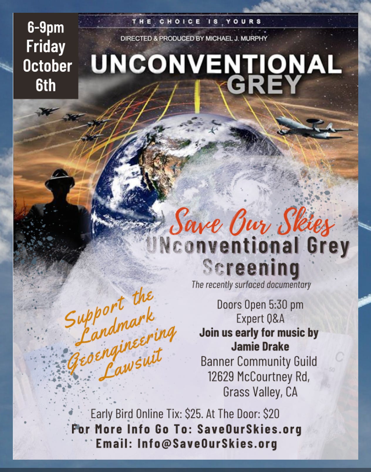 We will be screening the recently-surfaced documentary by the late Michael J. Murphy (director/producer What In The World Are They Spraying), UNconventional Grey, followed by a Q&A by some of the film’s leading geoengineering experts who will be Zooming in.