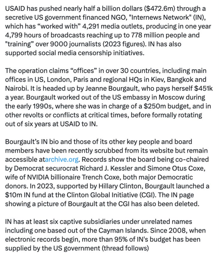 Here we have speaking at a World Economic Forum, Jeanne Bourgault, “President and CEO of Internews (USAID recipient), who leads the strategic management of the organization and its programs in more than 80 countries worldwide,” explaining how they need to work with the “global advertising industry,” and how they work on the “inclusion lists and exclusions lists” of those “spreading misinformation.”