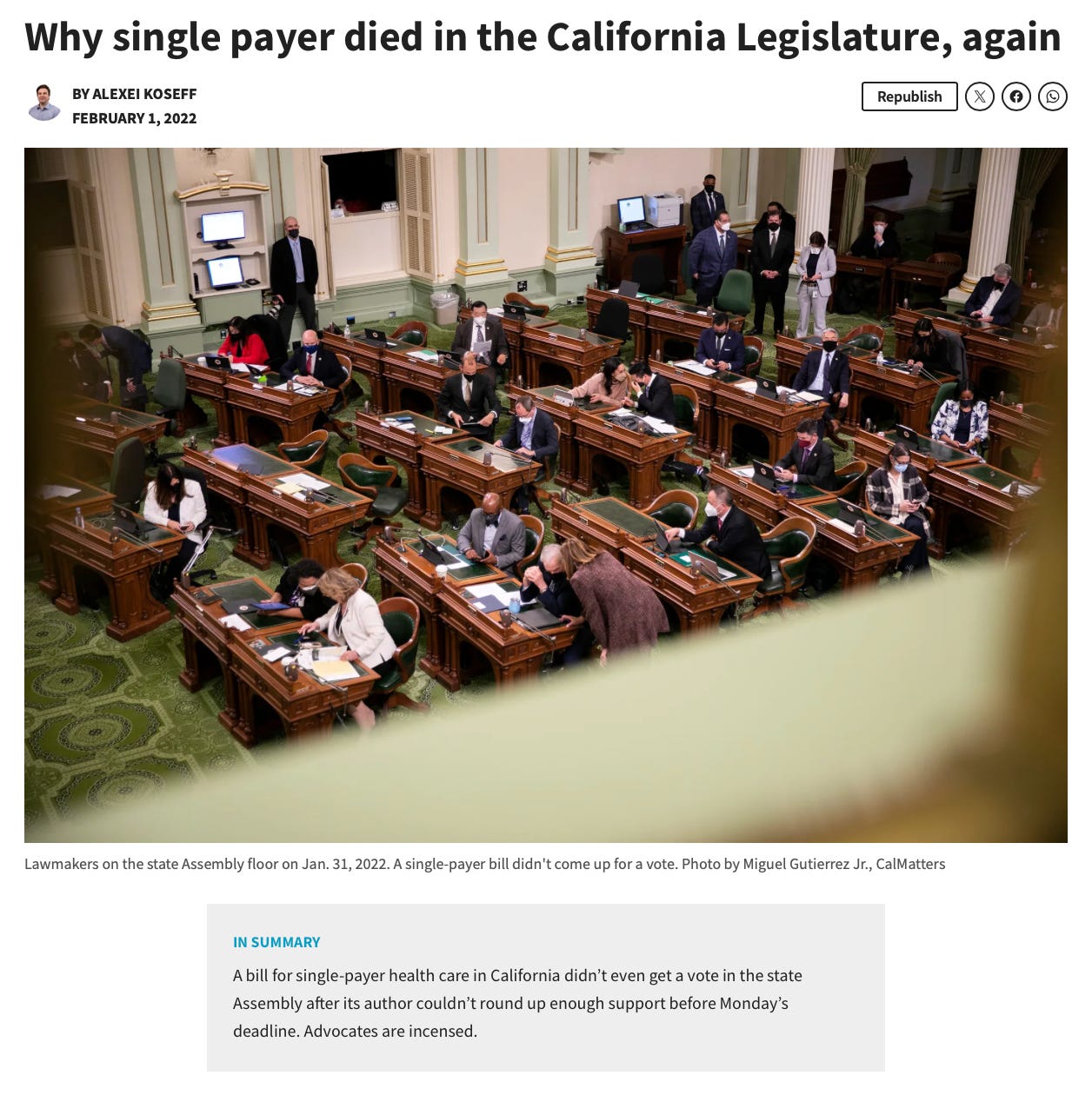 During the Covid lockdowns, when the public was confined to their homes, California legislators attempted to push through a bill, AB 1400, that would force all Californians into a single-payer healthcare system, invade their medical privacy, and double their taxes to fund the scheme.