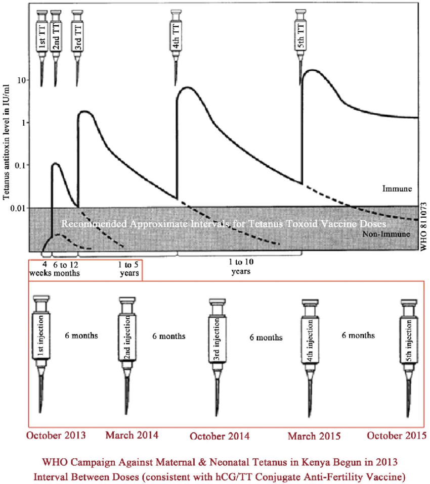 They neglected to include in their statement that the WHO announced a “birth-control vaccine” for “family planning” in 1976 when WHO researchers had “conjugated tetanus toxoid (TT) with human chorionic gonadotropin (hCG), producing a “birth-control” vaccine. Conjugating TT with hCG causes pregnancy hormones to be attacked by the immune system. Expected results are [spontaneous] abortions in pregnant females and/or infertility in recipients not yet impregnated. Repeated inoculations prolong infertility.”