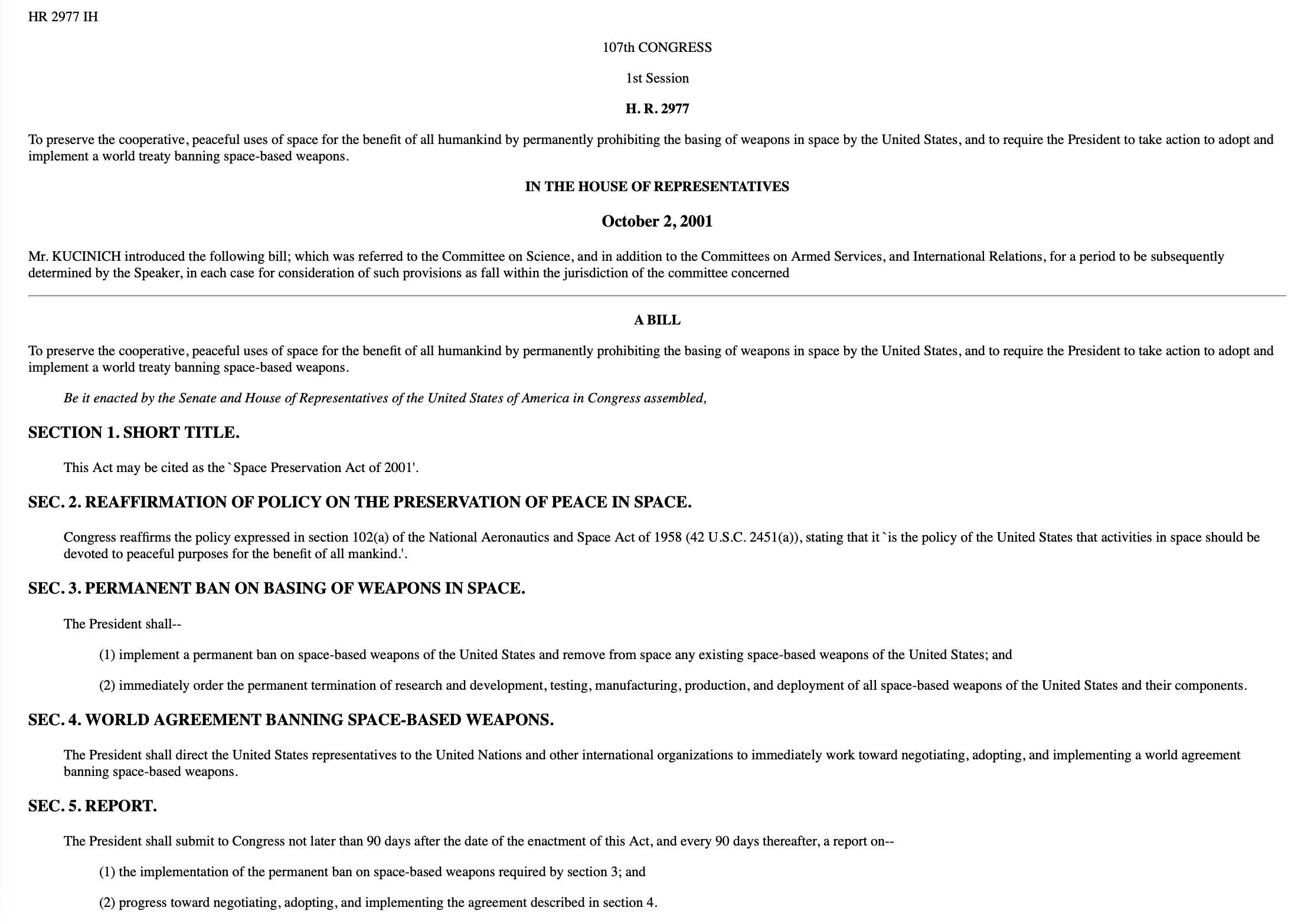 I’m not alone in this thinking. Many of our legislators thought the same, dating back to 2001 when legislation introduced H.R 2977 to ban such space weaponry: