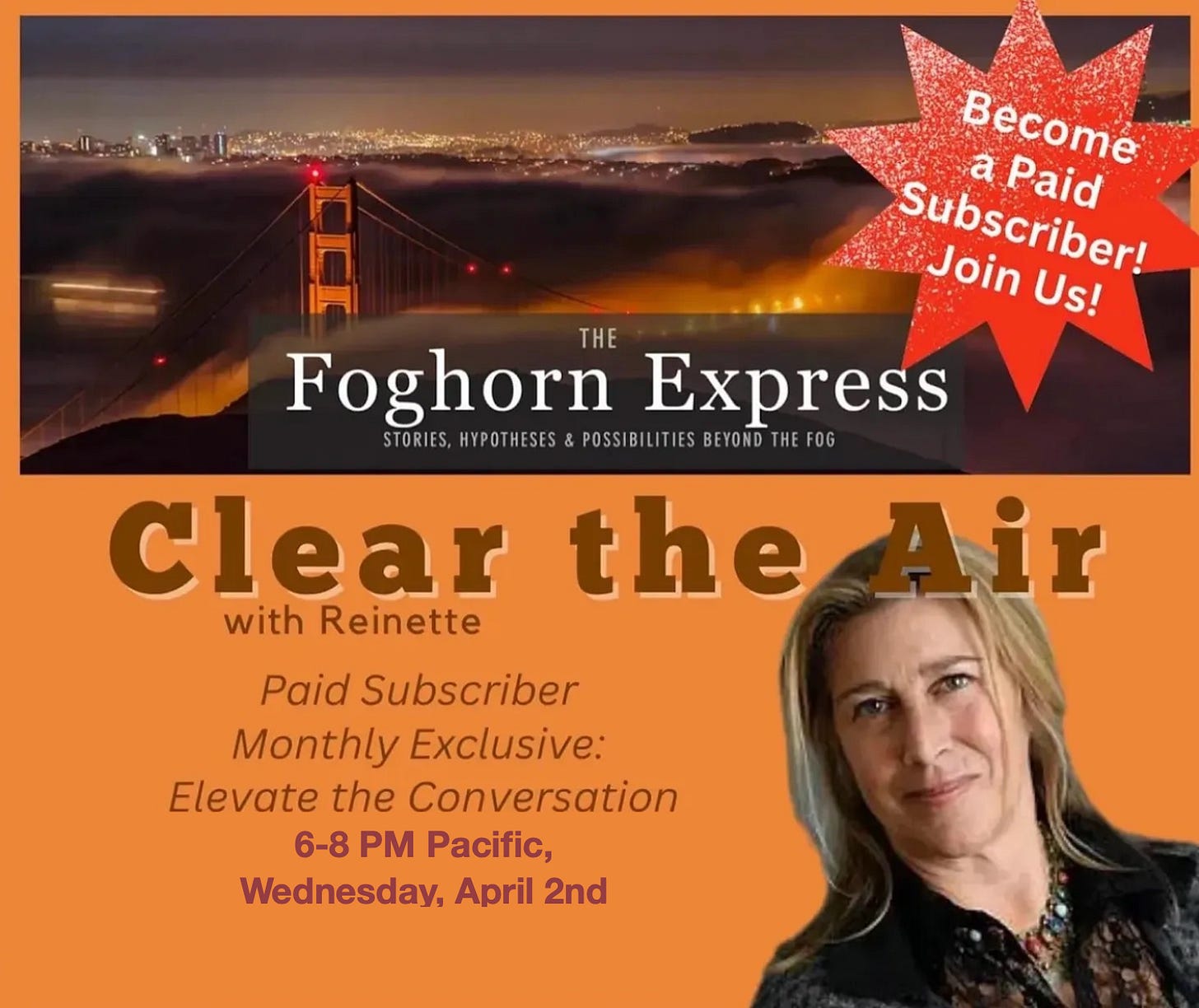 As a PAID SUBSCRIBER, you can join me for another exclusive Clear the Air With Reinette online conversation THIS Wednesday, April 2nd, at 6 PM Pacific.