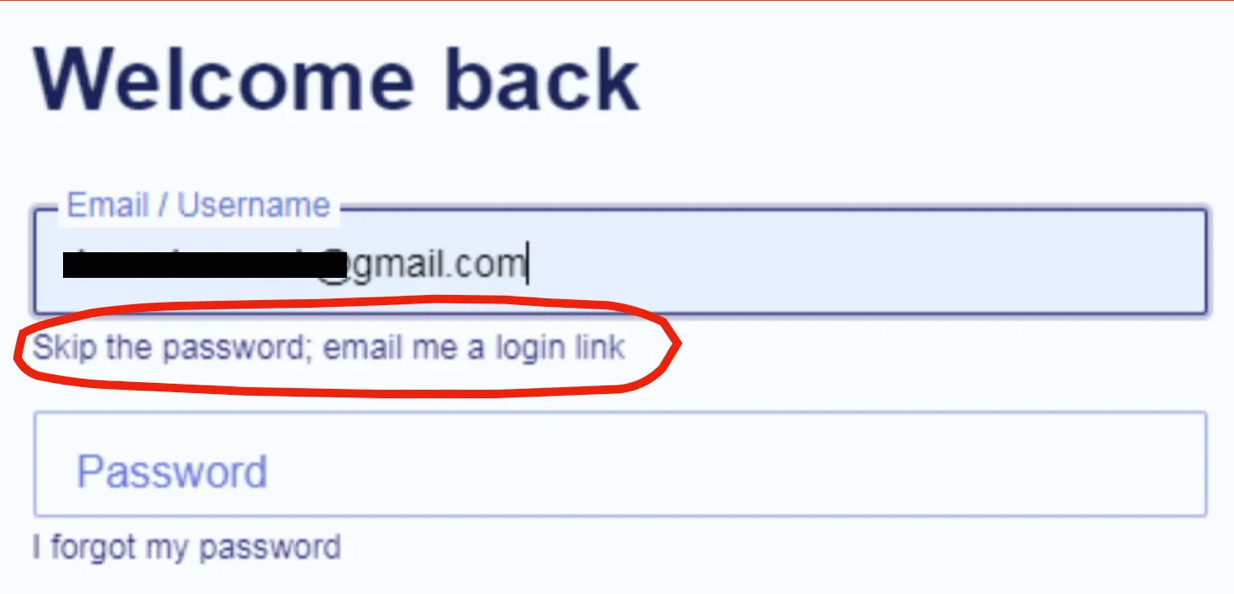 If you keep getting kicked out do this: When you start typing in your email address, the secret "link" below the box appears that allows you to skip the password. It will send a link to click on instead.