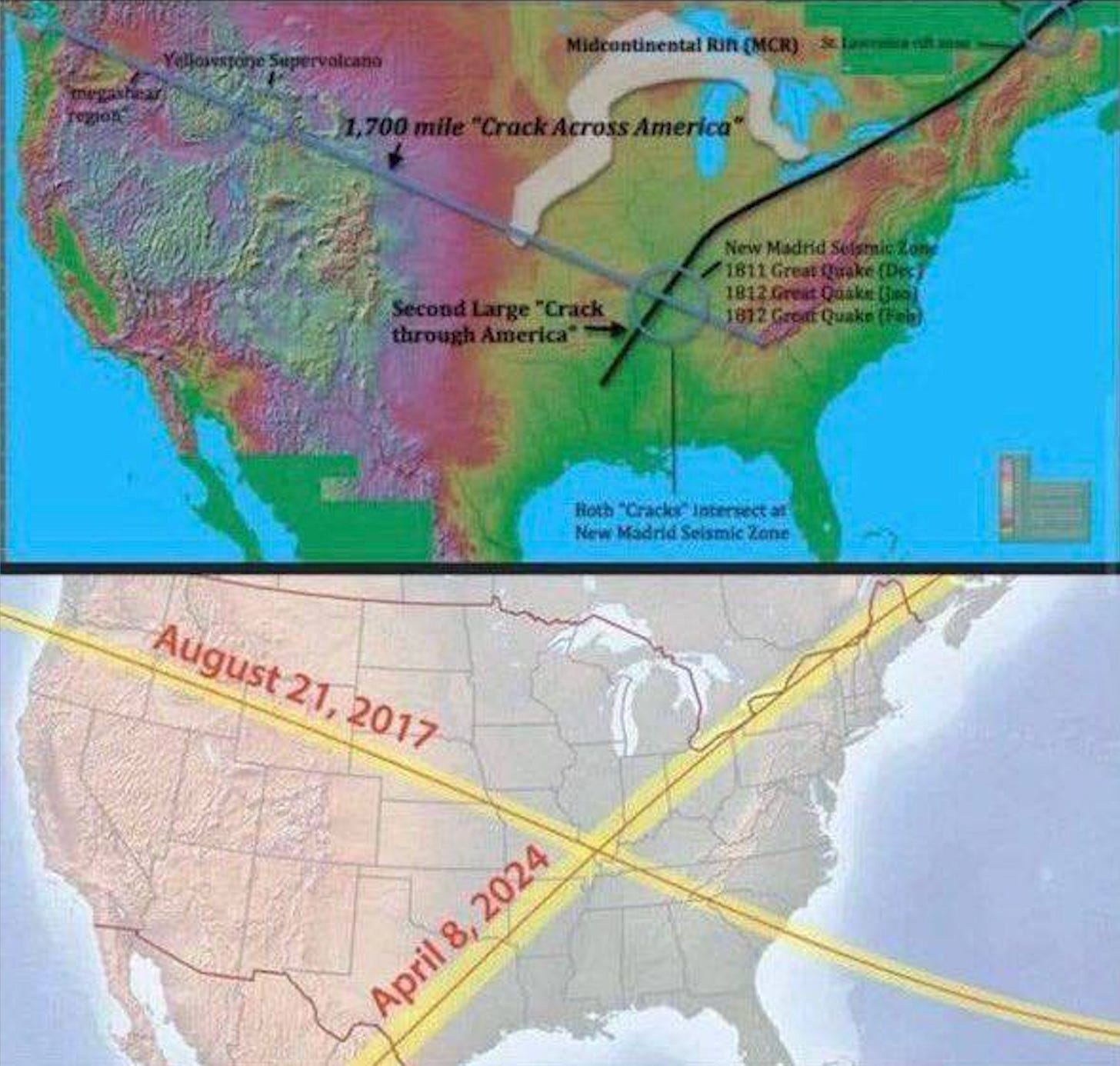 In 1981, a 1,700-mile crack across America was discovered using modern-day gravity mapping satellite data. It is called the Montana to Florida Lineament or the Missouris Gravity Low. This crack, seen in blue, intersects the Madrid Fault Line, which is represented in black. Interestingly, these fault lines and the path of the Great American Eclipse, which took place on August 21st, 2017, and the upcoming April 8th, 2023, Eclipse, are identical.