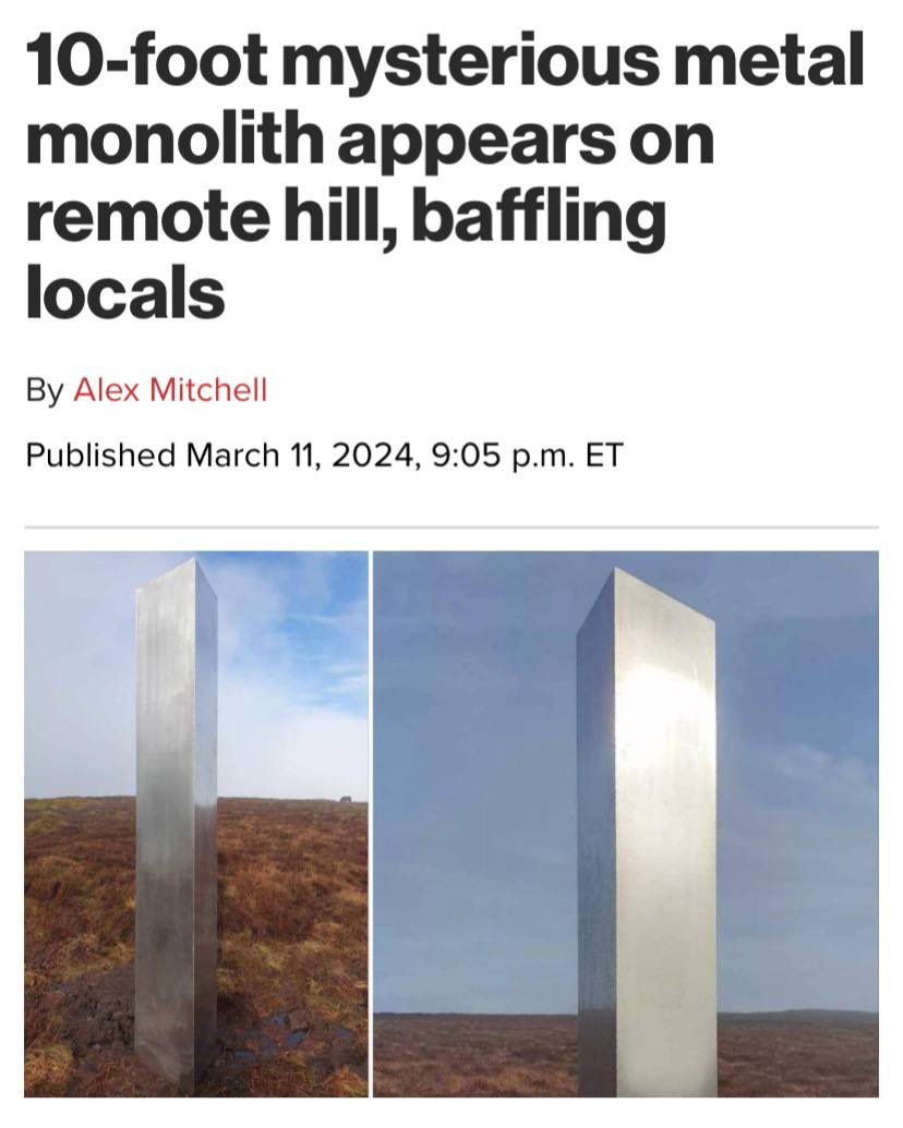 Ten-foot mysterious monoliths are back. The one in 2020 appeared less than one month before the Covid shot release and a total solar eclipse and this most recent one was found a couple of weeks ago, less than a month before the upcoming total solar eclipse.